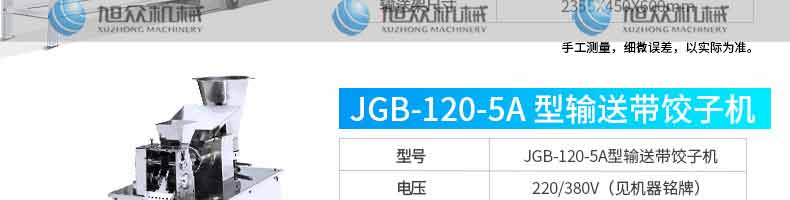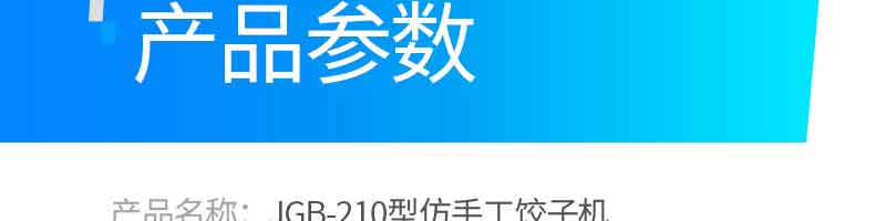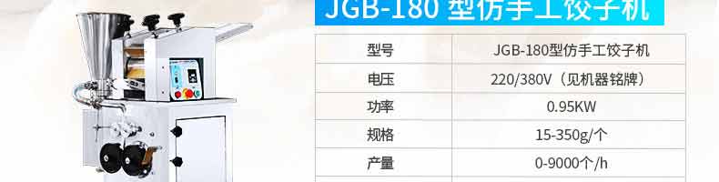 JGB-210型仿手工餃子機,本機采用自動壓面皮包餃子的新工藝技術,本機可生產速凍餃子等,能生產各種肉餡、肉菜混合餡、全菜餡及其他種餡的餃子,適用于餃子館、食品生產廠家、賓館、飯店、餐廳、團體食堂、學校、部隊。免費上門安裝調試,贈送面點工藝